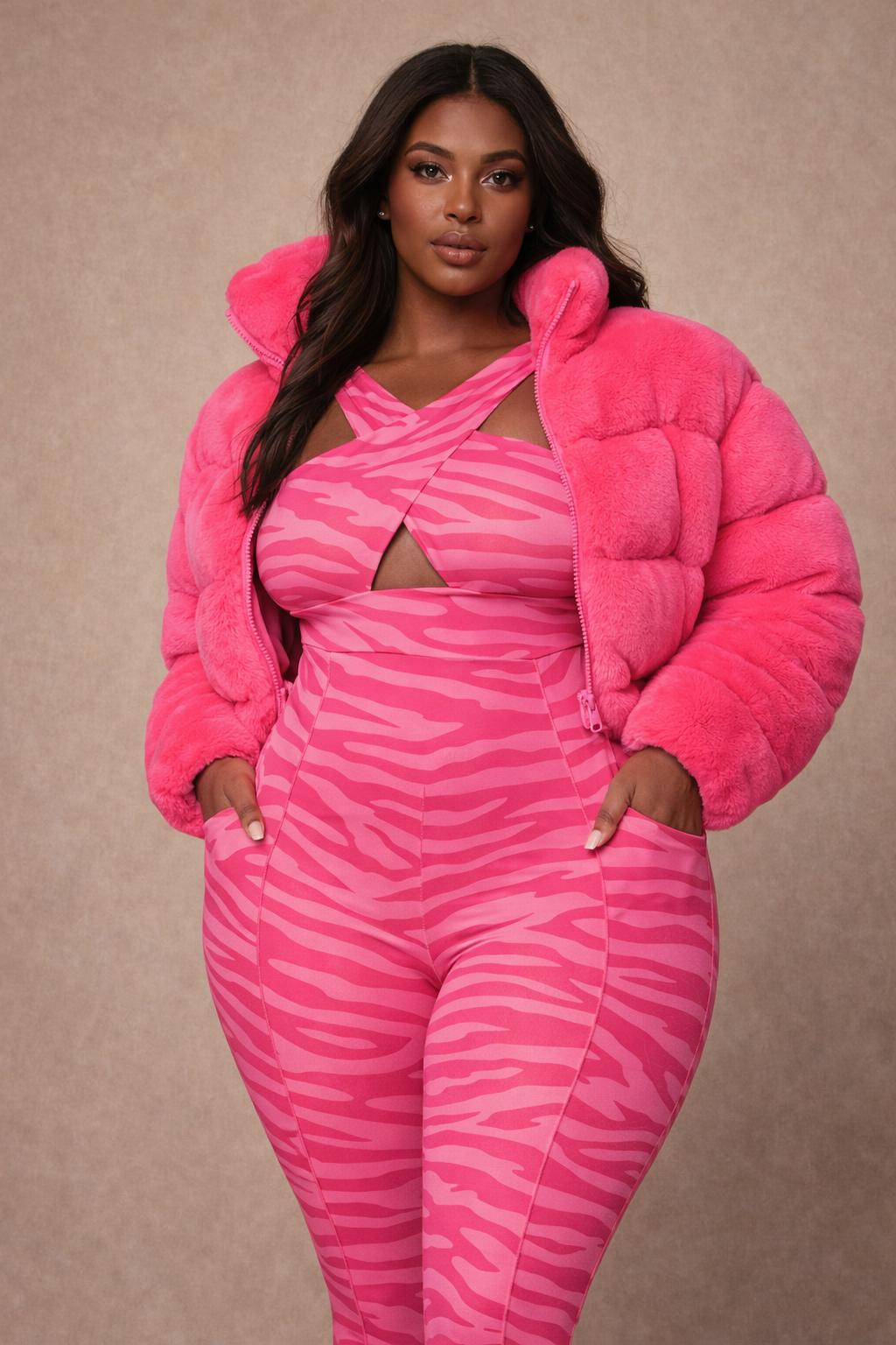 Style Tip: Wear open over the Pink Zebra Sculpt Jumpsuit for a coordinated, high-fashion look.